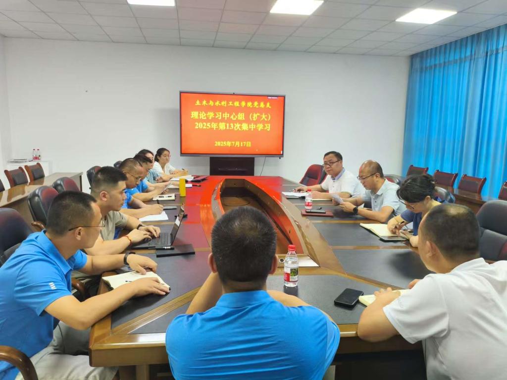 7月17日下午,土木与水利工程学院党总支理论学习中心组(扩大)2025年第13次集中学习会在知行楼M347会议室举行。学院党总支理论学习中心组成员、组织员、各党支部书记、综合办、教务办和学生办主任、党务秘书等参加了学习会。会议由学院党总支书记肖鹏主持。