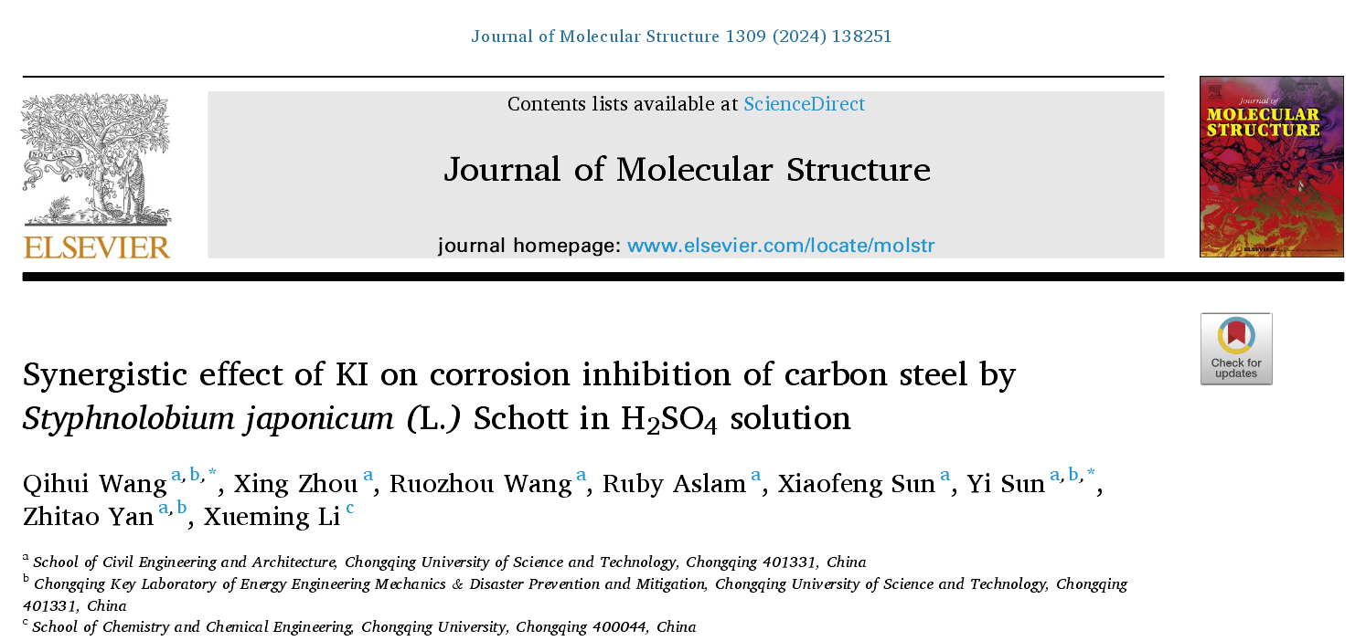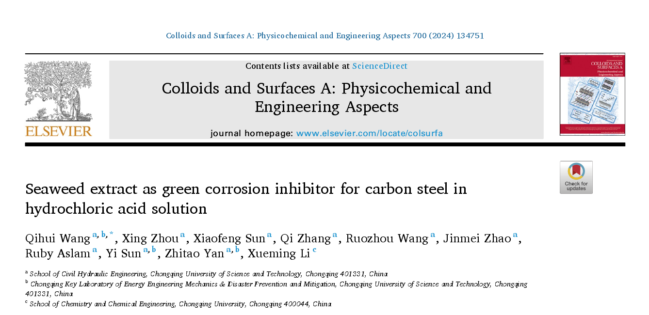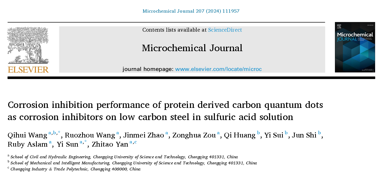 近期,我院孙毅教授团队在腐蚀与防护领域取得重要研究成果,相关成果发表在工程技术领域权威期刊《Colloids and Surfaces A: Physicochemical and Engineering Aspects》(影响因子:5.3,中科院二区)、《Journal of Molecular Structure》(影响因子:4.6,中科院二区)和《Microchemical Journal》(影响因子:5.0,中科院二区)。重庆科技大学土木与水利工程学院为第一单位,王琪辉老师、晏致涛教授以及Ruby Aslam博士后分别为上述论文的第一作者和共同作者。