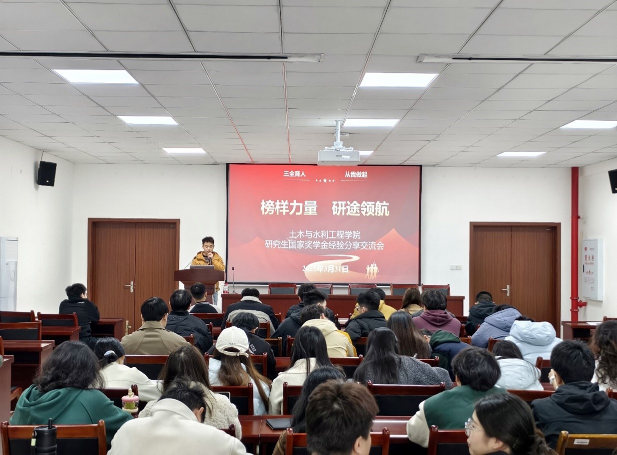 为深入落实学校"三全育人,从我做起"工作部署,充分发挥榜样引领作用,营造积极向上的学术氛围,3月31日,土木与水利工程学院在知行楼M334会议室组织开展"榜样力量,研途领航"国奖经验分享交流会。活动邀请学院三位研究生国家奖学金获得者杨士鉴、赖旺进、林西其进行经验分享,学院副处级组织员于桂宝、研究生辅导员及近百名研究生参与本次学习交流。