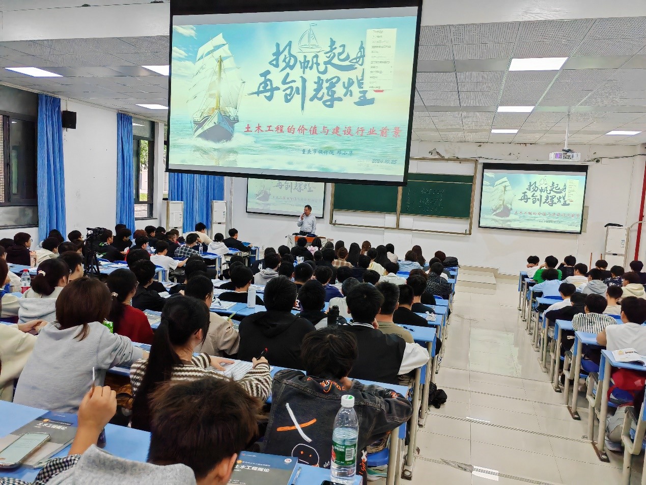 邓小华以其深厚的行业背景和丰富的实践经验,围绕土木工程专业的现状与优势、当前建设领域面临的问题以及土木工程未来的发展方向等方面进行了深入浅出的讲解。针对当前建设领域面临的问题,详细分析了工程质量、施工安全、环境保护等方面的挑战。他指出,当前土木工程行业正面临着前所未有的挑战与机遇,随着工程规模的扩大和复杂度的提高,并且在新技术、新材料和新工艺的推动下,土木工程将向智能化、绿色化、信息化方向迈进,如何确保工程质量、保障施工安全以及实现可持续发展已成为行业亟待解决的问题。他希望广大师生要密切关注行业动态,紧跟时代步伐,积极投身于技术创新和工程实践,为解决具体工程问题贡献自己的力量。
