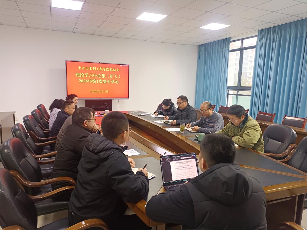1月21日上午,土木与水利工程学院党总支理论学习中心组(扩大)2026年第1次集中学习会在知行楼347会议室举行。学院党总支理论学习中心组成员、组织员、各党支部书记、各办公室主任、党务秘书等参加了学习会。会议由学院党总支书记肖鹏主持。