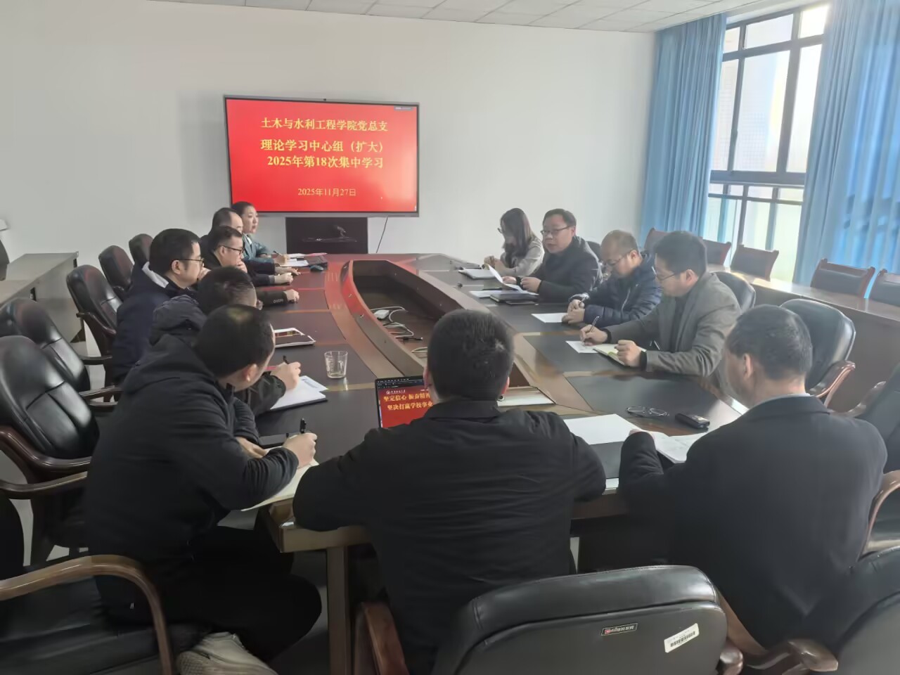 11月27日上午,土木与水利工程学院党总支理论学习中心组(扩大)2025年第18次集中学习会在知行楼M347会议室举行。学院党总支理论学习中心组成员、组织员、各党支部书记、各办公室主任、党务秘书等参加了学习会。会议由学院党总支书记肖鹏主持。