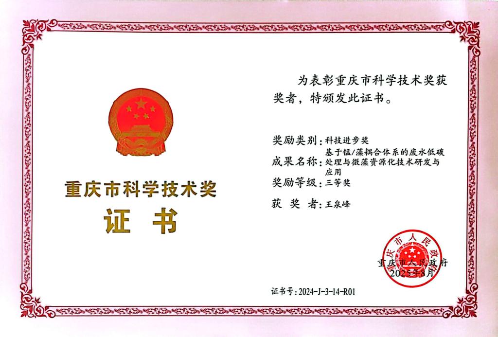8月28日,2025年重庆市科技创新大会在渝召开。会上正式揭晓2024年度重庆市科学技术奖,我校作为第一单位,土木与水利工程学院给排水科学与工程专业教师王泉峰作为第一完成人的项目成果“基于锰/藻耦合体系的废水低碳处理与微藻资源化技术研发与应用”荣获重庆市科技进步三等奖。