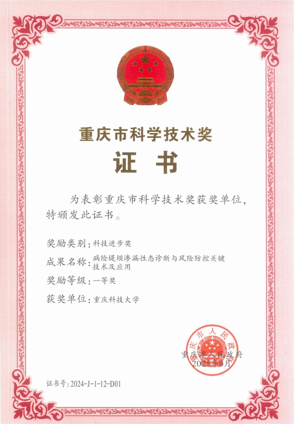 重庆市科技创新大会于8月28日召开,由赵明阶教授团队完成的“病险堤坝渗漏性态诊断与风险防控关键技术及应用”项目获得2024年度重庆市科技进步一等奖。