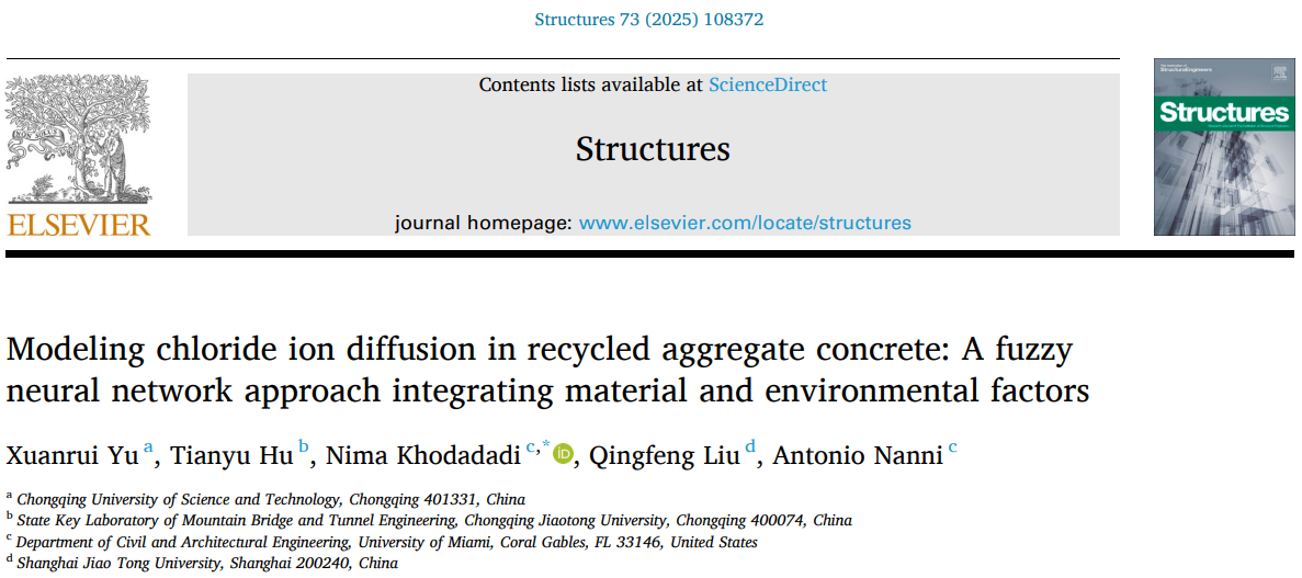 近日,结构工程领域权威期刊《Structures》(影响因子:4.1,JCR2,中科院二区)发表了我院喻宣瑞博士在结构工程领域的研究成果:“Modeling chloride ion diffusion in recycled aggregate concrete: A fuzzy neural network approach integrating material and environmental factors”。重庆科技大学土木与水利工程学院为第一单位,喻宣瑞博士为论文的第一作者。