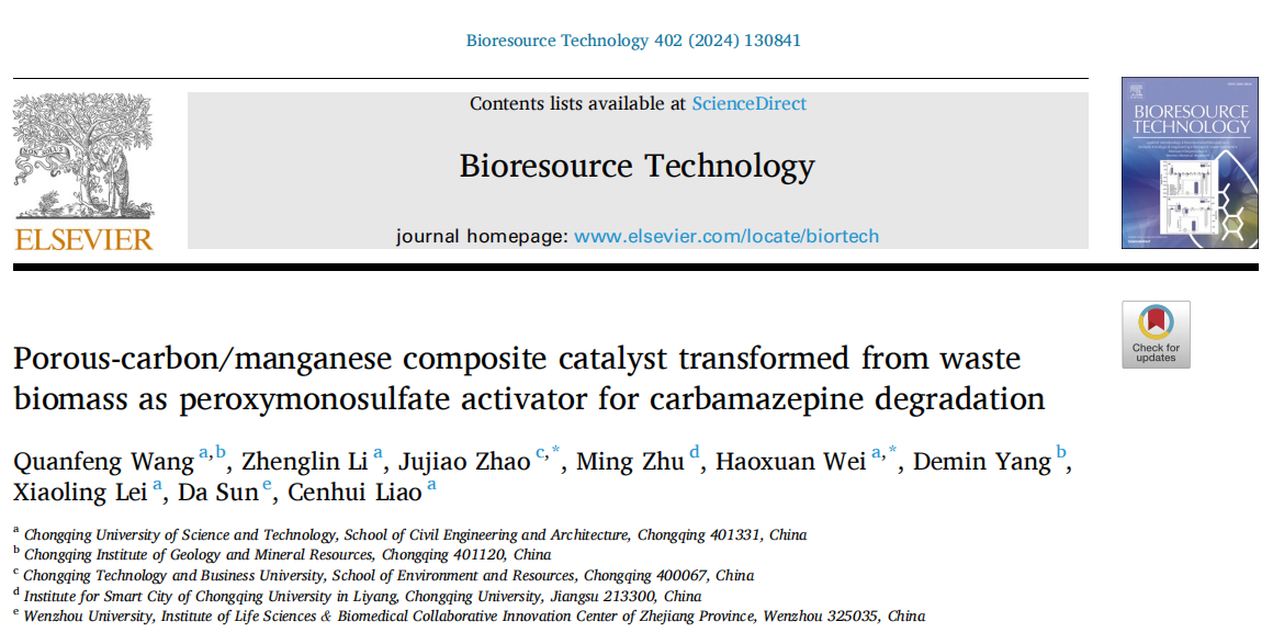 近期,工程技术、环境科学与生态学领域权威知名期刊《Bioresource Technology》(影响因子:9.7,中科院一区TOP期刊)发表了我校给排水科学与工程专业王泉峰副教授和曾国明副教授在微藻处理及资源化利用领域的合作研究成果:“Porous-carbon/manganese composite catalyst transformed from waste biomass as peroxymonosulfate activator for carbamazepine degradation”和“Activated carbon fiber loaded nano zero-valent iron for Microcystis aeruginosa removal: Performance and mechanisms”。重庆科技大学土木与水利工程学院为第一单位,王泉峰副教授与曾国明副教授分别为上述论文的第一作者,魏昊轩博士后为通讯作者。